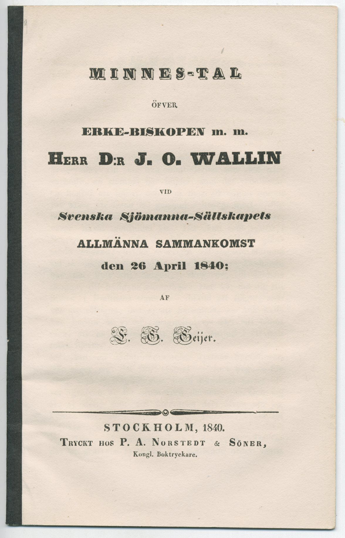Minnes-tal öfver erke-biskopen m.m. herr d:r J. O. Wallin vid Svenska sjömanna-sällskapets allmänna sammankomst den 26 april 1840.