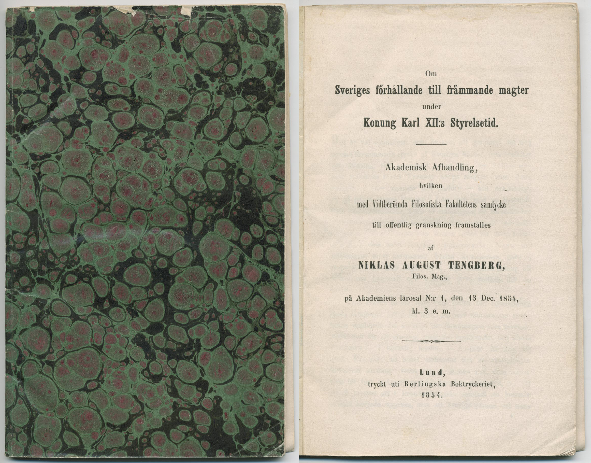 Lund, Berlingska boktryckeriet, 1854. 8:o. (2),76 s. Häftat i samtida marmorerat omslag med några små nagg. Lite lös i häftningen. Delvis med smärre fuktränder i övre marginalen.