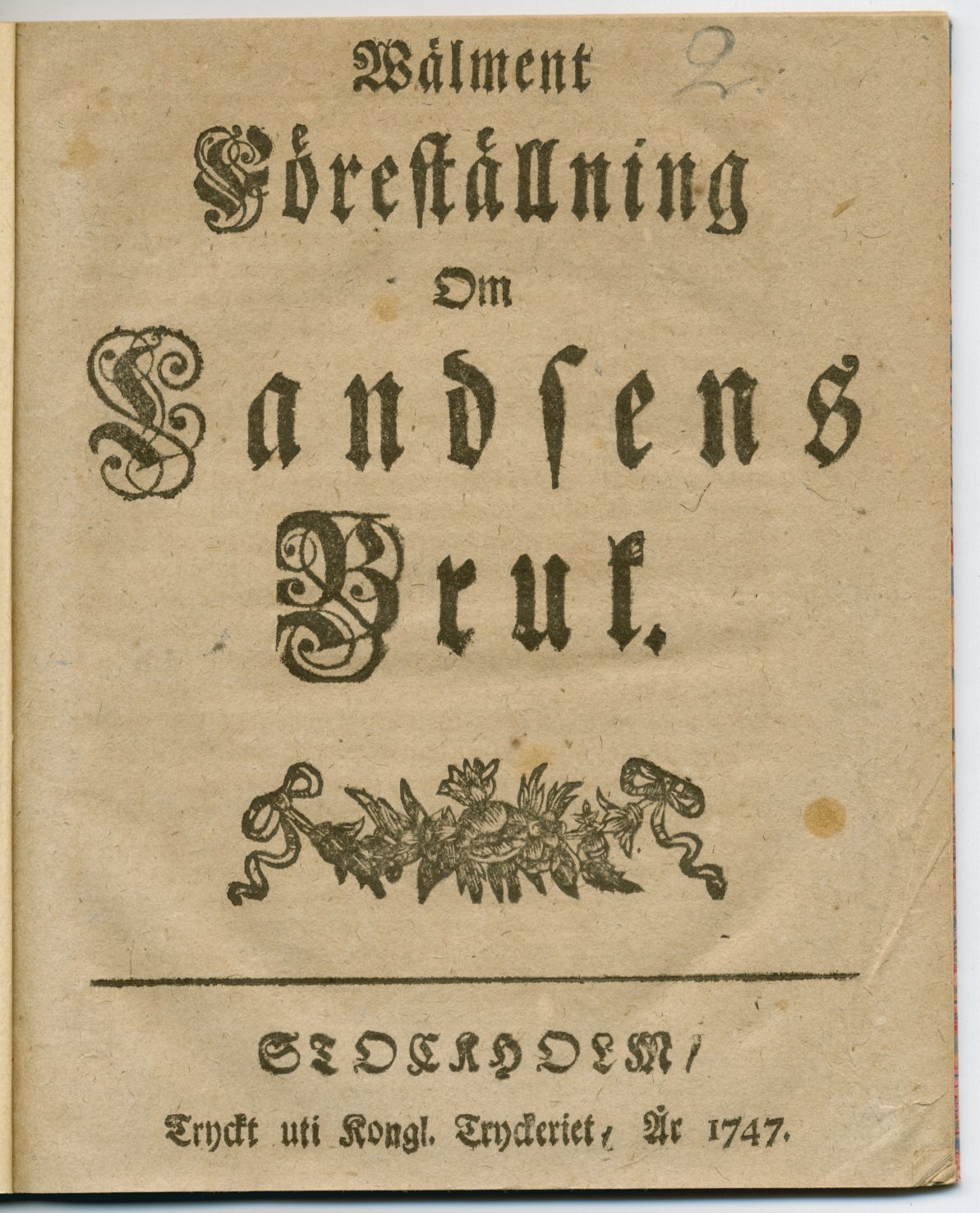 Sthlm, Kongl. tryckeriet, 1747. 4:o. 24 s. Enkelt marmorerat pappbd från 1900-talets mitt med blekt rygg. Inlagan lite bruntonad och titelbladet med några småfläckar. Ur Hjalmar Gustafssons bibliotek.