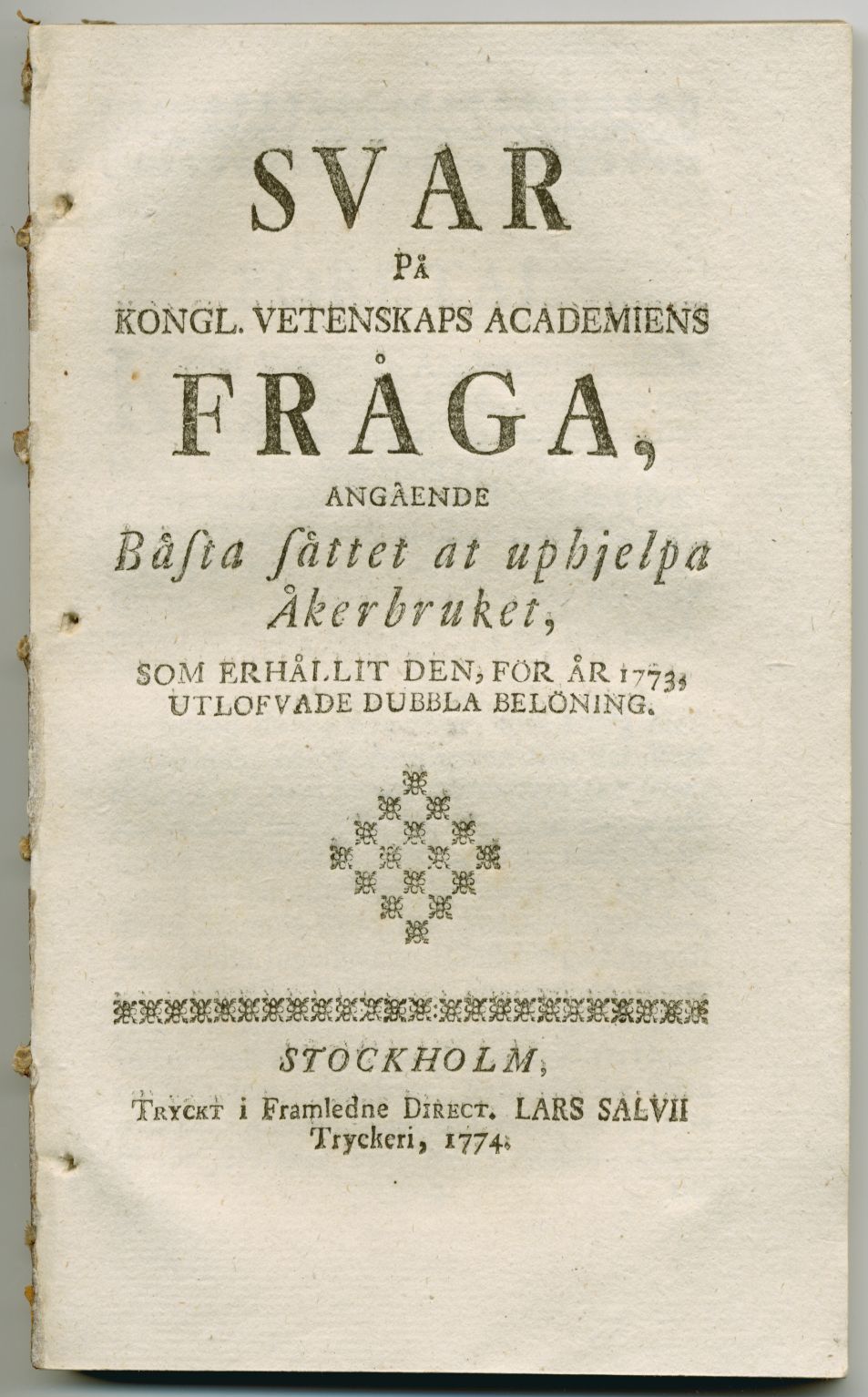 Svar på kongl. Vetenskaps academiens fråga, angående bästa sättet at uphjelpa åkerbruket, som erhållit den, för år 1773, utlofvade dubbla belöning.