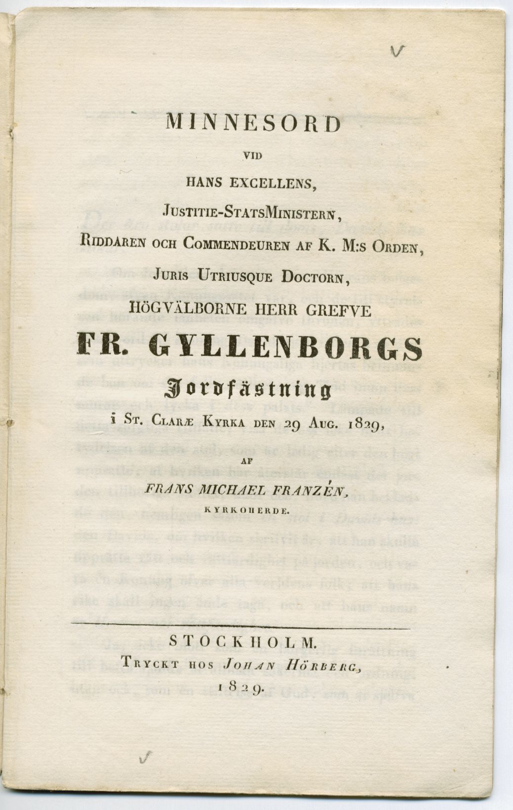 Minnesord vid hans excellens, justitie-statsministern, riddaren och commendeuren af k. m:s orden, juris utriusque doctorn, högvälborne herr grefve Fr. Gyllenborgs jordfästning i St. Claræ kyrka den 29 aug. 1829.
