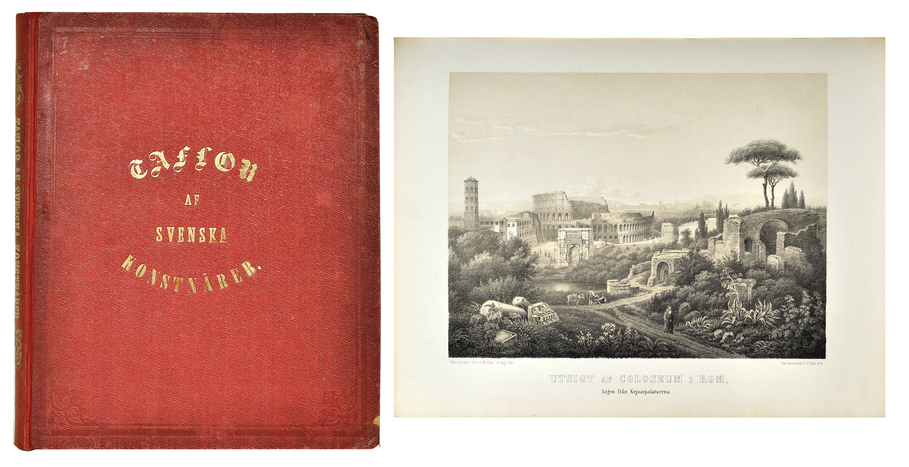 Sthlm, P. A. Norstedt & söner, 1856. Stor 4:o. (6),108 s. & 6 litograferade plr. Lite fläckigt och nött rött oklbd med guldtryckt titel, blindpressat ramtryck samt ryggtitel i guld. Helt guldsnitt. Ryggen skickligt förnyad i gammal tid och delar av det ursprungliga ryggklotet inklusive titeln applicerat på sin ursprungliga plats. Enstaka lagerfläckar och ett fåtal bläckfläckar. Planscherna har skyddspapper av pergamyn i olika färger. Medbundet i början ett vit glättat något missfärgat blankt blad med tillskrift: ”Åt lärjungen i Mos. församlingens goss-skola Ernst Salomonson för berömlig flit och berömligt uppförande. Å styrelsens vägnar Axel Lamm den 7:de april 1857”.