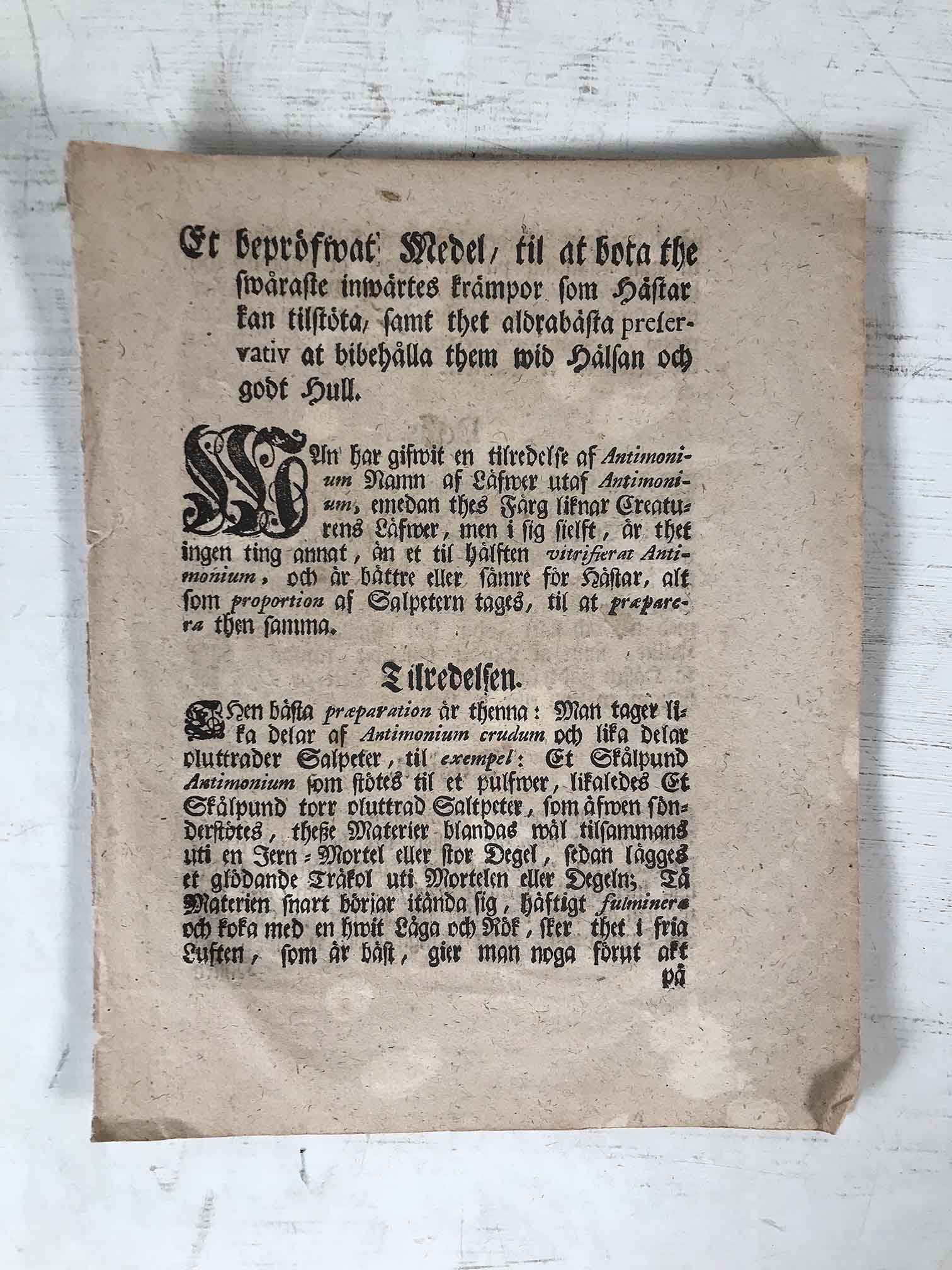 Et bepröfwat medel, til at bota the swåraste inwärtes krämpor som hästar kan tilstöta, samt thet aldrabästa preservativ at bibehålla them wid hälsan och godt hull. [=rubrik].