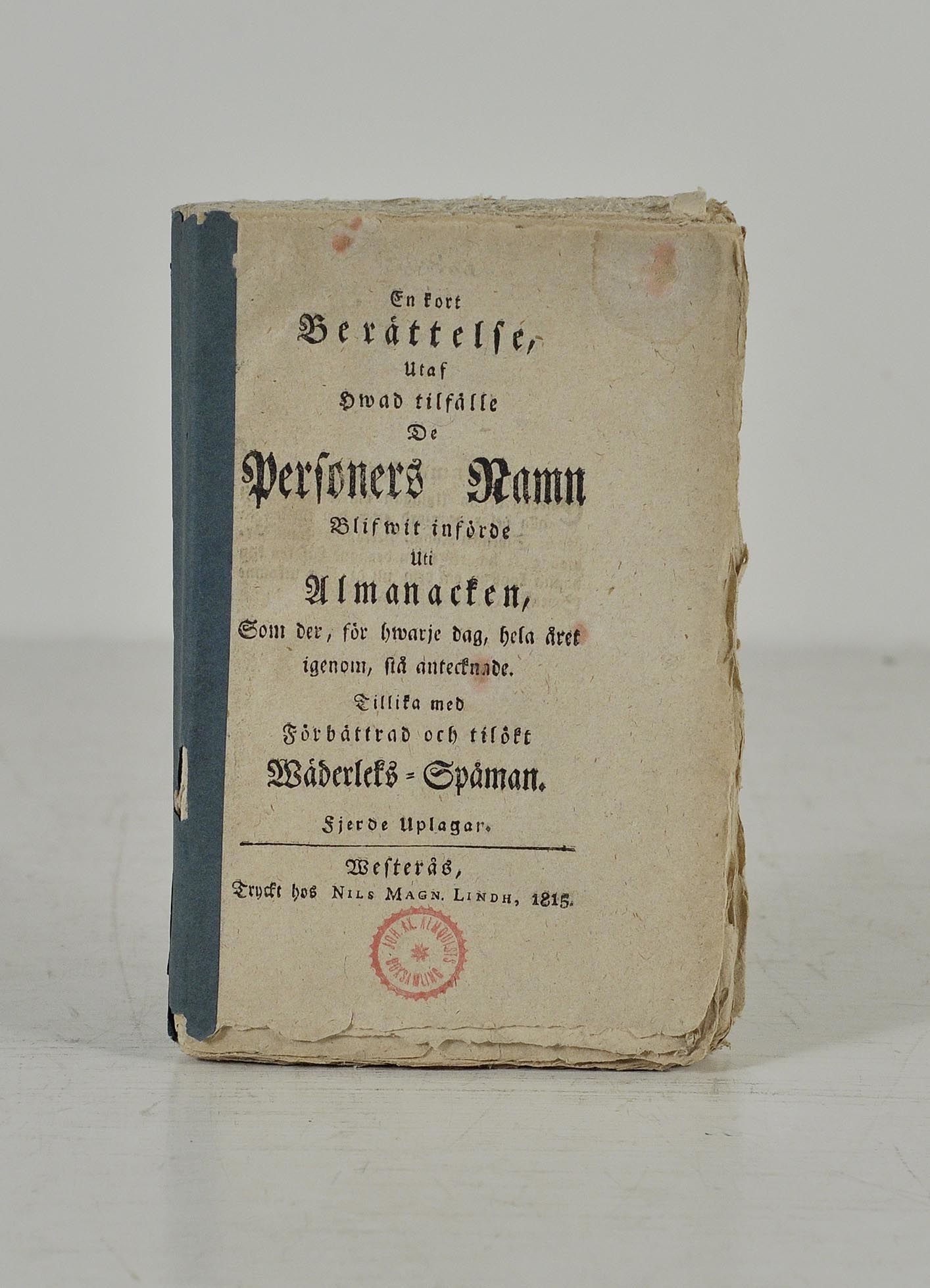 En kort berättelse, utaf hwad tilfälle de personers namn blifwit införde uti almanacken, som der, för hwarje dag, hela året igenom, stå antecknade. Tillika med förbättrad och tilökt wäderleks-spåman. Fjerde uplagan.