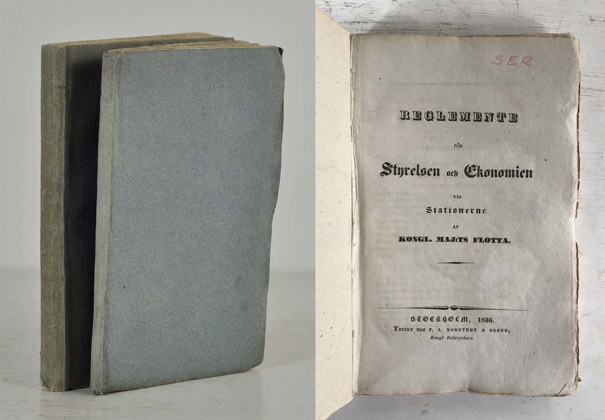 Sthlm, P. A. Norstedt & söner, 1836. 8:o. VI,200 s. + Bilagor t. Regl. för styr. o. ek. vid k.m. flotta. [=rubrik nedtill]. (Sthlm, P. A. Norstedt & söner, 1836). 8:o. (8) s. & 26 utvikbara tryckta tabeller. Häftade och oskurna i två samtida gråpappomslag. ”SER” i rödpenna på titelbladet till första volymen.