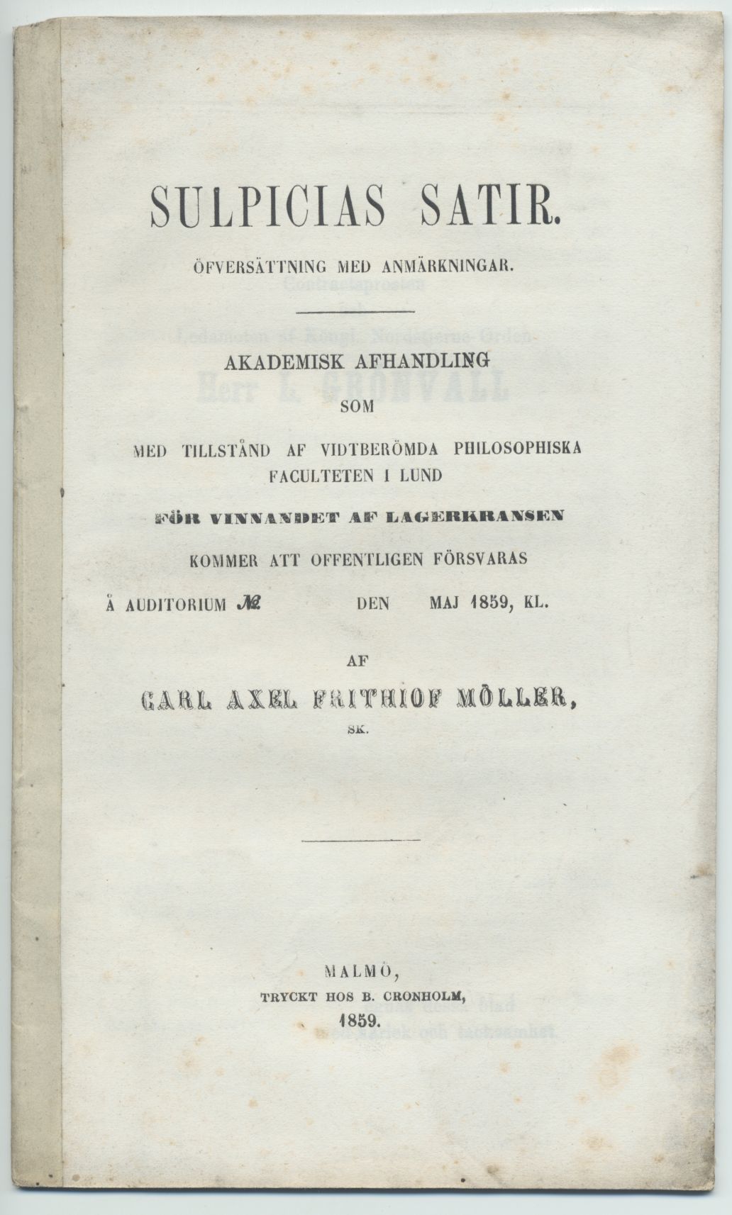 Malmö, B. Cronholm 1859. 8:o. (4),26,(2 blanka) s. Häftad med samtida ryggremsa. Titelsidan och sista blanka bladet lite lagerfläckiga.