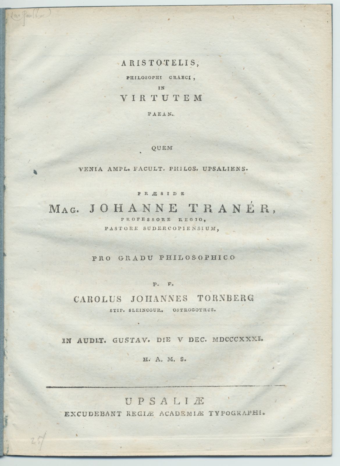 [Aristoteles] TRANÉR, JOHAN [preses] & TORNBERG, CARL JOHAN [respondent].