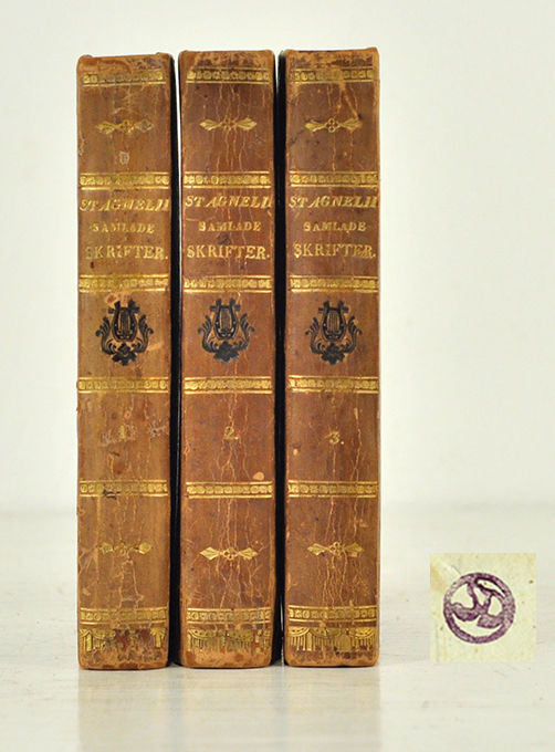 Sthlm, A. G. Hellsten, 1836. 12:o. Porträtt,431,(1) + 423,(1 blank,8) + 451,(5) s. Tre samtida ljusbruna hfrbd med guldornerade ryggar som har varsin svartpressad lyra. Blåstänkta snitt. Ryggarna något nötta och med ytliga sprickor. Pärmpappret delvis lite avskavt. Jämnt bruntonade och med enstaka fläckar, mer i andra delen. Rund violett senare stpl ”SD” på pärmarnas insidor.