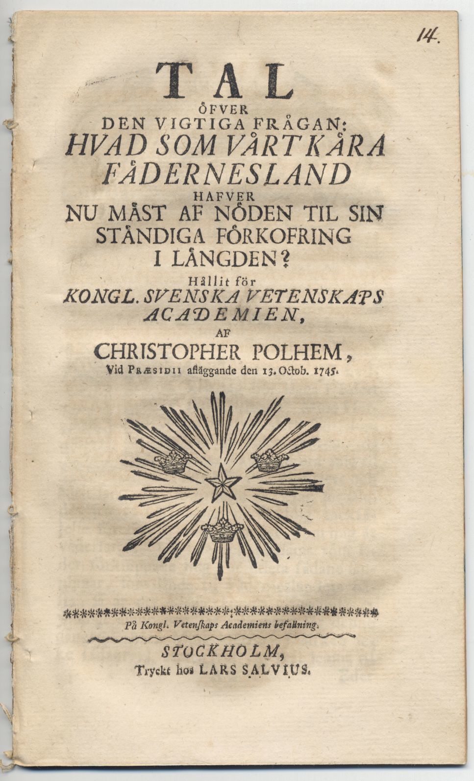 Sthlm, L. Salvius, (1745). 8:o. 23 s. Med träsnittsvinjett med strålande nordsjärna omgiven av tre kronor. Tagen ur band. gamla stänkta snitt. Med en gammal bläcknumrering upptill på titelsidan.