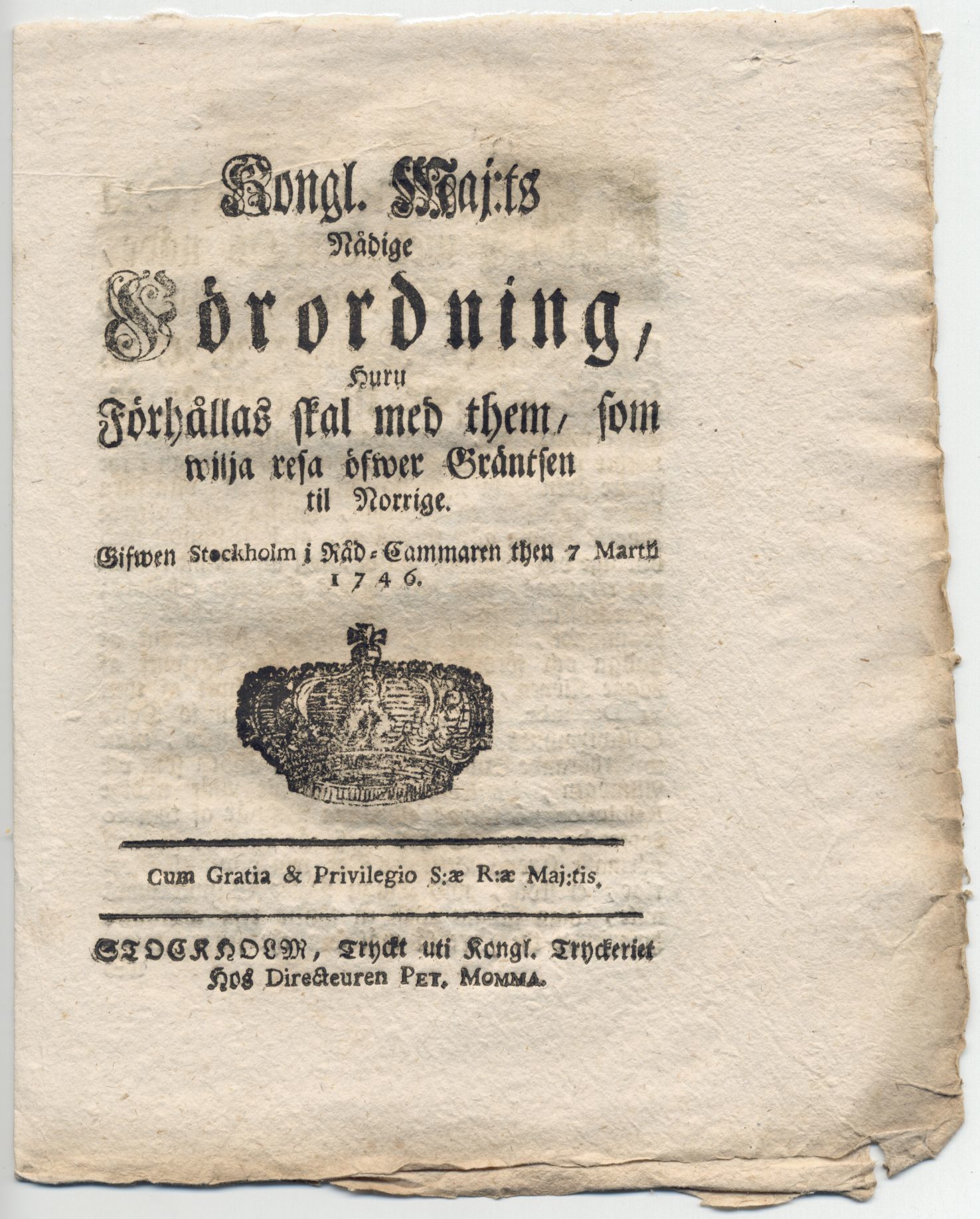 Kongl. maj:ts nådige förordning/ huru förhållas skal med them/ som wilja resa öfwer gräntsen til Norrige. Gifwen Stockholm i råd-cammaren then 7 martii 1746.