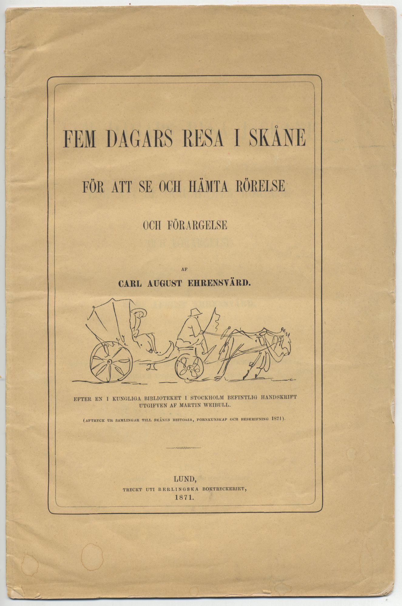 Fem dagars resa i Skåne för att se och hämta rörelse och förargelse. Efter en i Kungliga biblioteket i Stockholm befintlig handskrift utgifven af Martin Weibull. (Aftryck ur Samlingar till Skånes historia, fornkunskap och beskrifning 1871).