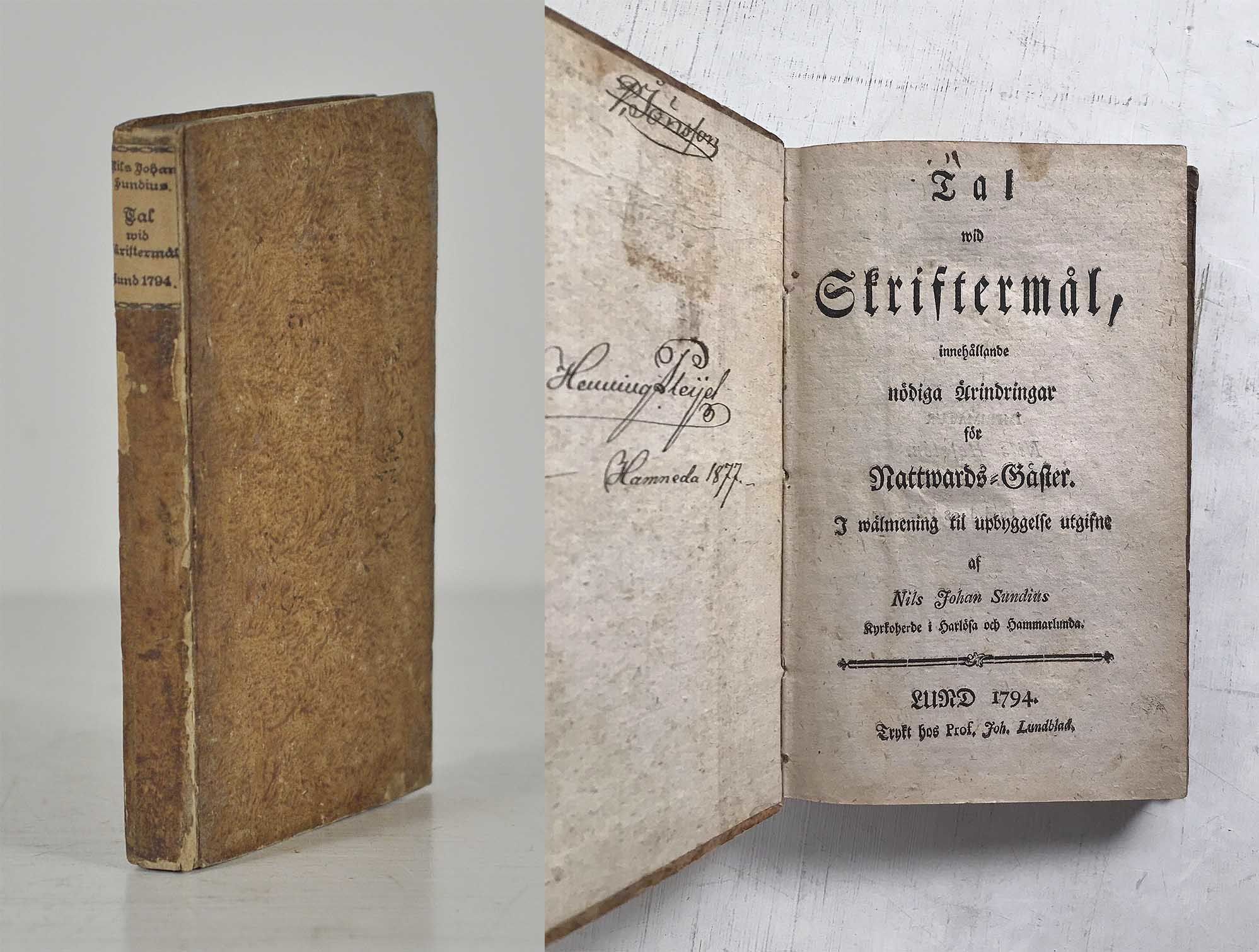 Lund, J. Lundblad, 1794. 8:o. (2),236 s. Samtida brunt klistermarmorerat pappbd med nyare tryckt titeletikett. Blåstänkta snitt. Pärmen fuktskadad vid ryggen och falsarna med lite tråkiga nötningar. Enstaka fläckar. En samling småfläckar i övre hörnet på s. 97-104 och en stark liten fläck i övre marginalen på s. 119-20. Med P. Jönsons överstrukna namnteckning, Henning Pleijels två namnteckningar från 1877, varav den ena daterad Hammeda, och Hilding Pleijels exlibris på bakpärmens insida.