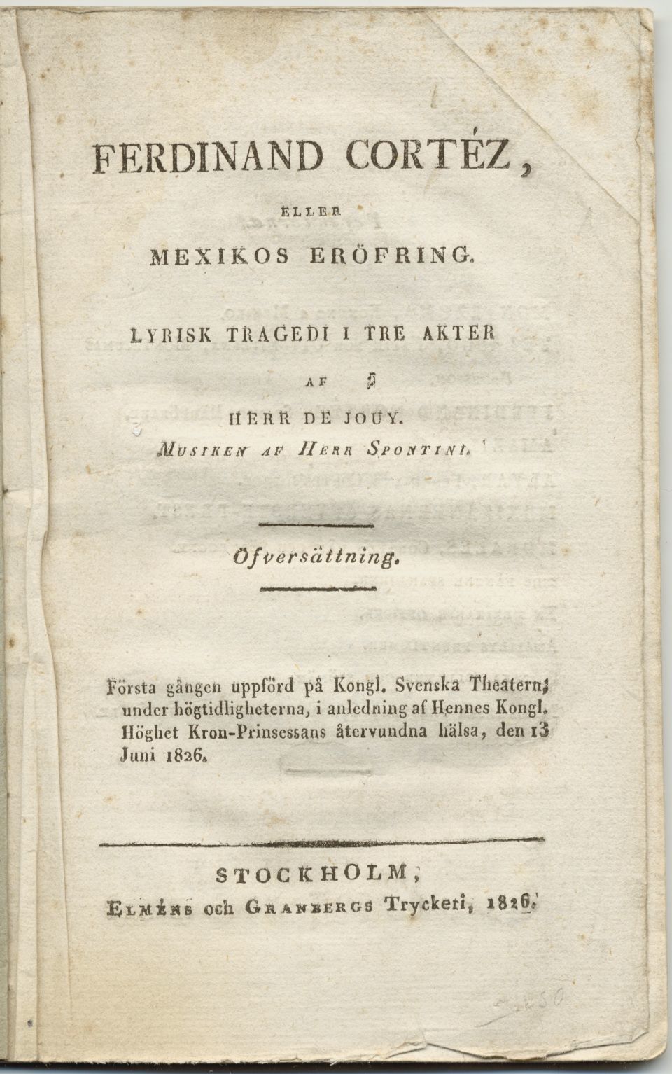 Ferdinand Cortéz, eller Mexikos eröfring. Lyrisk tragedi i tre akter. Musiken af herr Spontini. Öfversättning. Första gången uppförd på Kongl. svenska theatern; under högtidligheterna, i anledning av hennes kongl. höghet kron-prinsessans återvundna hälsa, den 13 juni 1826.