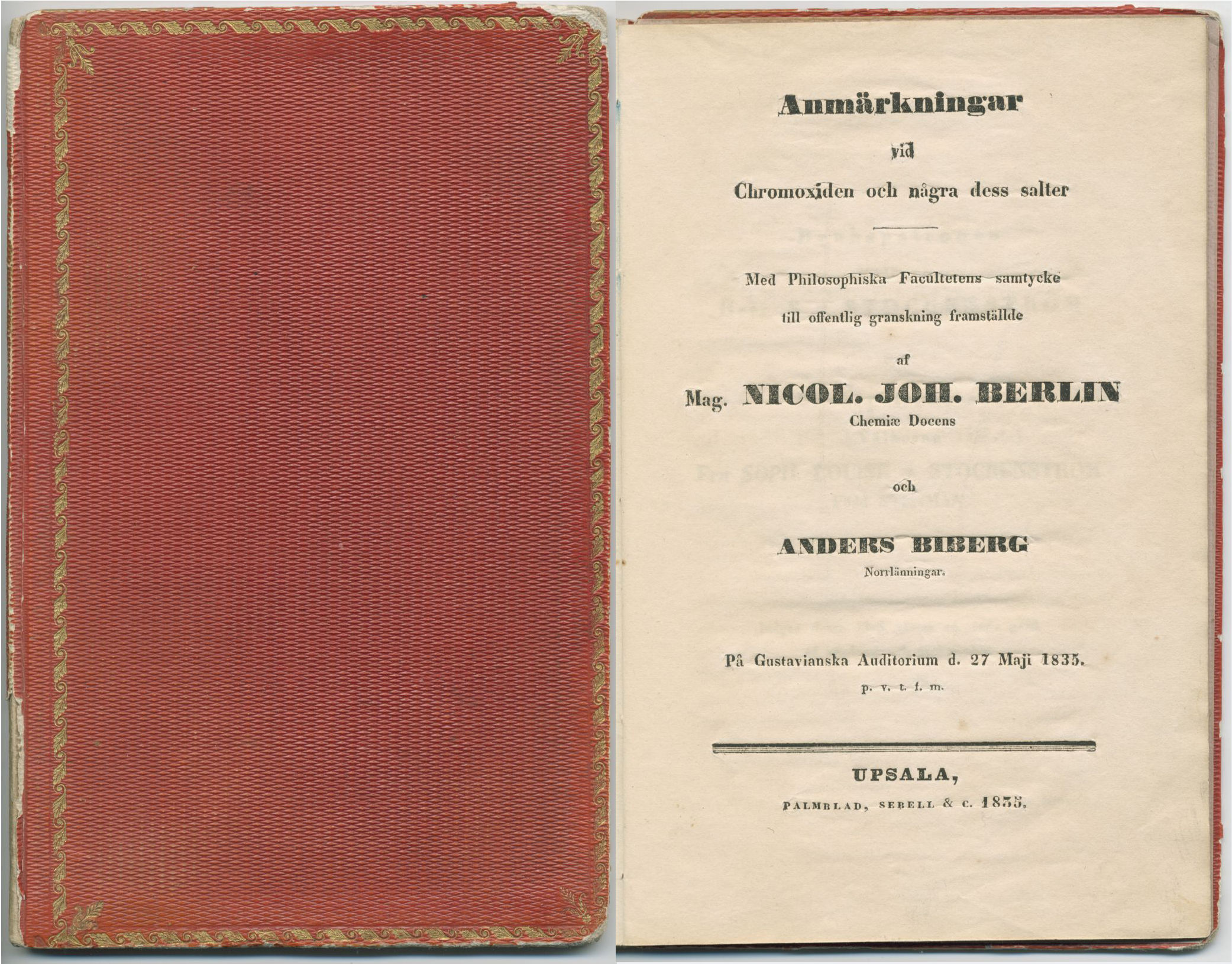 Marklin Catalogus disputationum 6. Berlin är inte angiven som preses utan bara som kemidocent. Båda författarna var ”Norrlänningar”. Biberg är undertecknare av de båda tryckta dedikationerna till S. von Stockenström med fru respektive I. Johan Tessmer med fru. Det sista bladet är ”Theses” och enligt gammal tradition på latin.