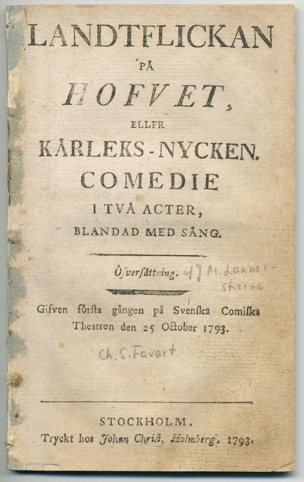 Landtflickan på hofvet, eller kärleks-nycken. Comedie i två acter, blandad med sång. Öfversättning. Gifven första gången på Svenska comiska theatren den 25 october 1793.