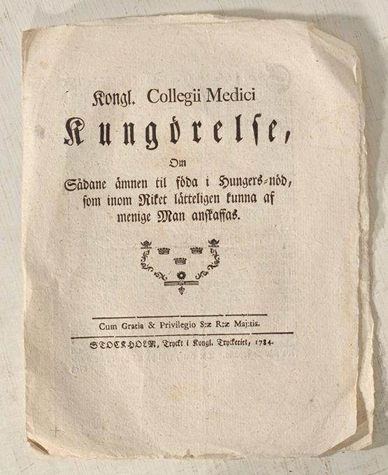 Kongl. Collegii medici kungörelse, om sådane ämnen til föda i hungers-nöd, som inom riket lätteligen kunna af menige man anskaffas.