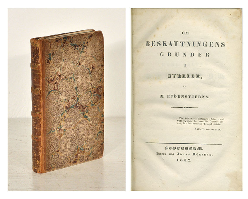 Sthlm, J. Hörberg, 1832. 8:o. (12),274,(1) s. & 22 utvikbara tryckta tabeller märkta A-Y. Samtida hårt nött hfrbd med breda upphöjda bind, guld- och blindpressad ryggdekor samt blåstänkta snitt. Nötta ytterfalsar och avnötta bind. Regnbågsfärgat läsband. Några svaga marginalfläckar. Nyare namnteckning Tore Lindahl.