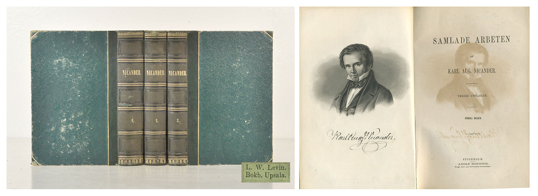 Sthlm, I. Marcus, 1862. 8:o. Graverat porträtt,XV,(1 blank,2),254,257-544 + IV,454,457-605,(1 blank),611-860 s. Tre samtida mörkgröna hfrbd med guldlinjerade ryggar och blindpressade ramar i fälten, etikettsignerade L. W. Levin, Uppsala. Blekta marmorerade snitt. Lätt nötta pärmar och pärmkanter. Den tjocka andra delen har naturligt nog delats upp på två volymer. Porträttet i början av del I har färgat av sig på titelbladet. Bra inlagor. Ur Arne Nilssons bibliotek.