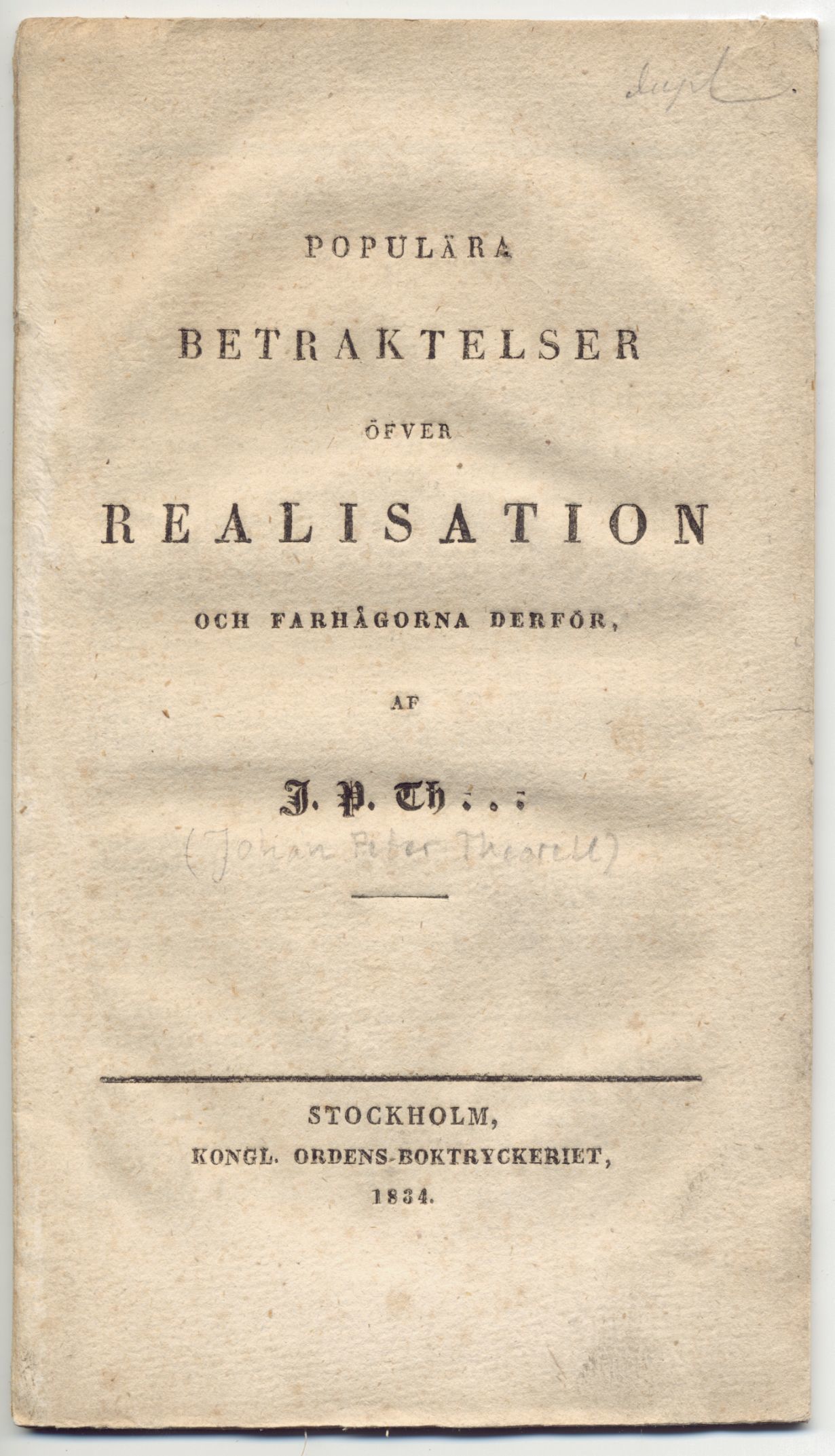 Populära betraktelser öfwer realisation och farhågorna derför, af J. P. Th...
