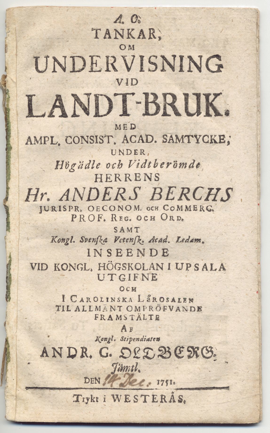 Lidén Catalogus disputationum 8. Hebbe Den svenska lantbrukslitteraturen 2172. Recenserades i ”Lärda tidningar” nr 6 1752. Möjligen är Oldberg författaren. Hyllningar på svenska av Petr. Edström, N. Åmann Nilsson och Nils Paulin. Inledningsvis dedikationer till Olof Kiörning, kyrkoherdarna Daniel Salin, Johan Lidin och Eric Sellin samt Oldbergs fyra ”högtbevågne gynnare och värde farbröder”. Avhandlingen föreslår bland annat tillsättandet av lantekonomer som allmogens vägledare för att förbättra lantbruket i landet. Anders Berch (1711-74), som var frihetstidens ledande merkantilist, fick Sveriges första ekonomiska professur 1741. I hans instruktion stadgades bland annat att både undervisningen och disputationerna skulle hållas på svenska.