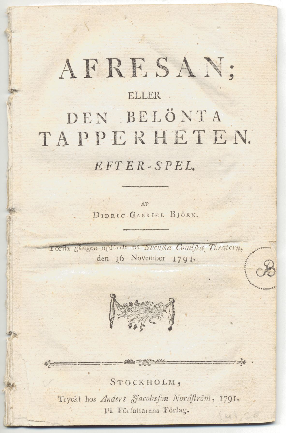 Afresan; eller den belönta tapperheten. Efter-spel. Första gången upfördt på Svenska comiska theatern, den 16 november 1791.