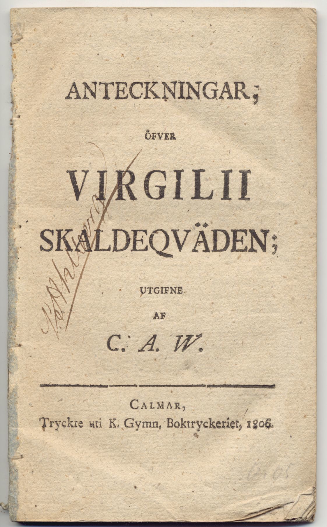 Kalmar, K. gymn. boktryckeriet, 1806. 8:o. 42 s. Häftad med gråpappersrester vid ryggen. Ryggens övre del lite musäten. Enstaka fläckar. Småveck i hörnen. S. Ahlbergs samtida namnteckning skriven tvärs över titeln.