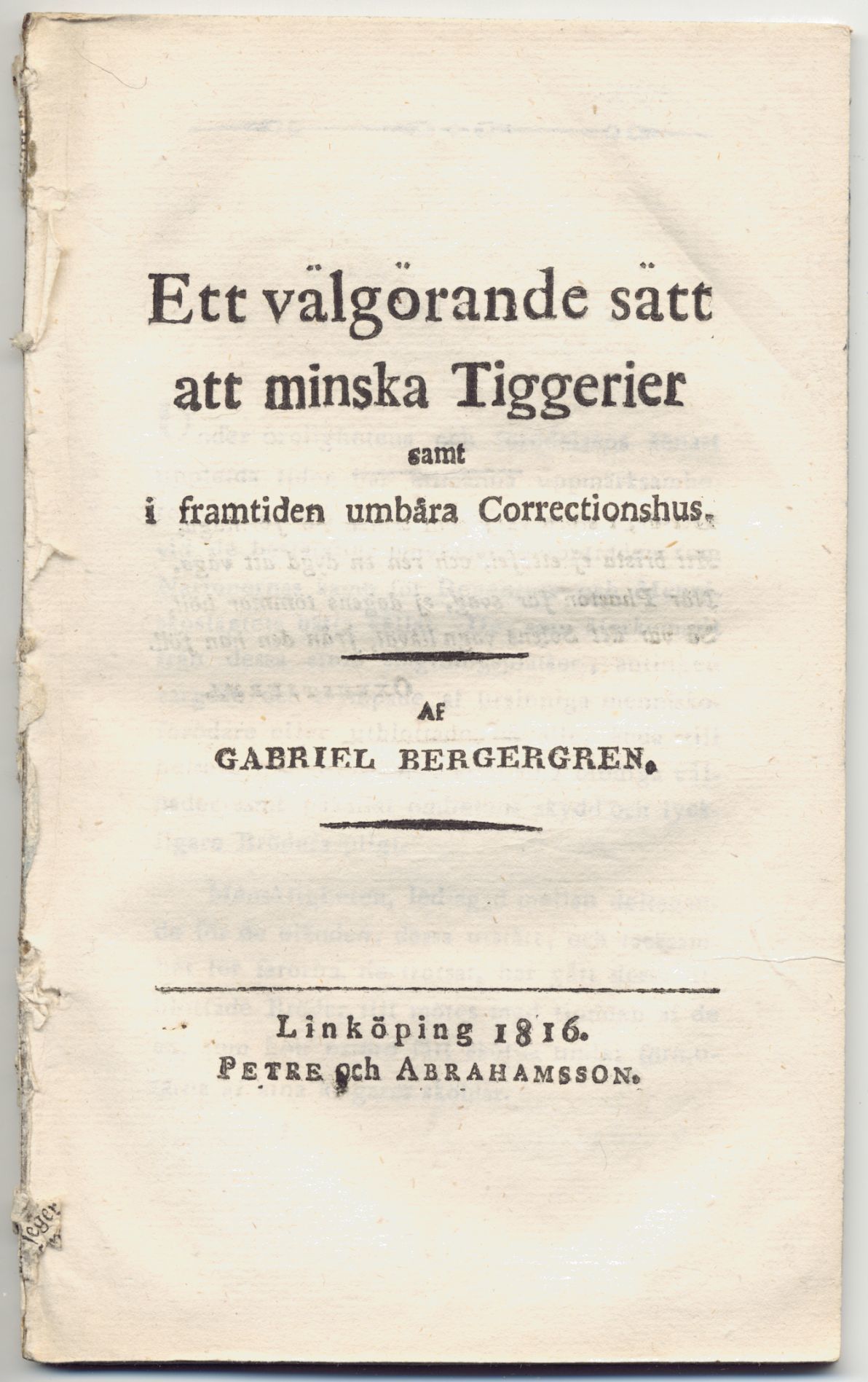 Gabriel Bergergren (1775-1841) var landskontorist och senare titulär landskamrer i Östergötland samt godsägare på Önneborg i Tjärstads socken, därefter Kallerstads säteri i St. Lars socken. Han donerade 1815 en fond till utackordering av värnlösa barn i Tjärstads socken. I skriften uttrycker han sin oro över sakernas tillstånd och föreslår flera sätt att komma till rätta med det tiggeri som uppstår på grund av att en del barn och ungdomar ur de lägre klassserna lämnas vind för våg. I flera fall tas exempel från Östergötland.