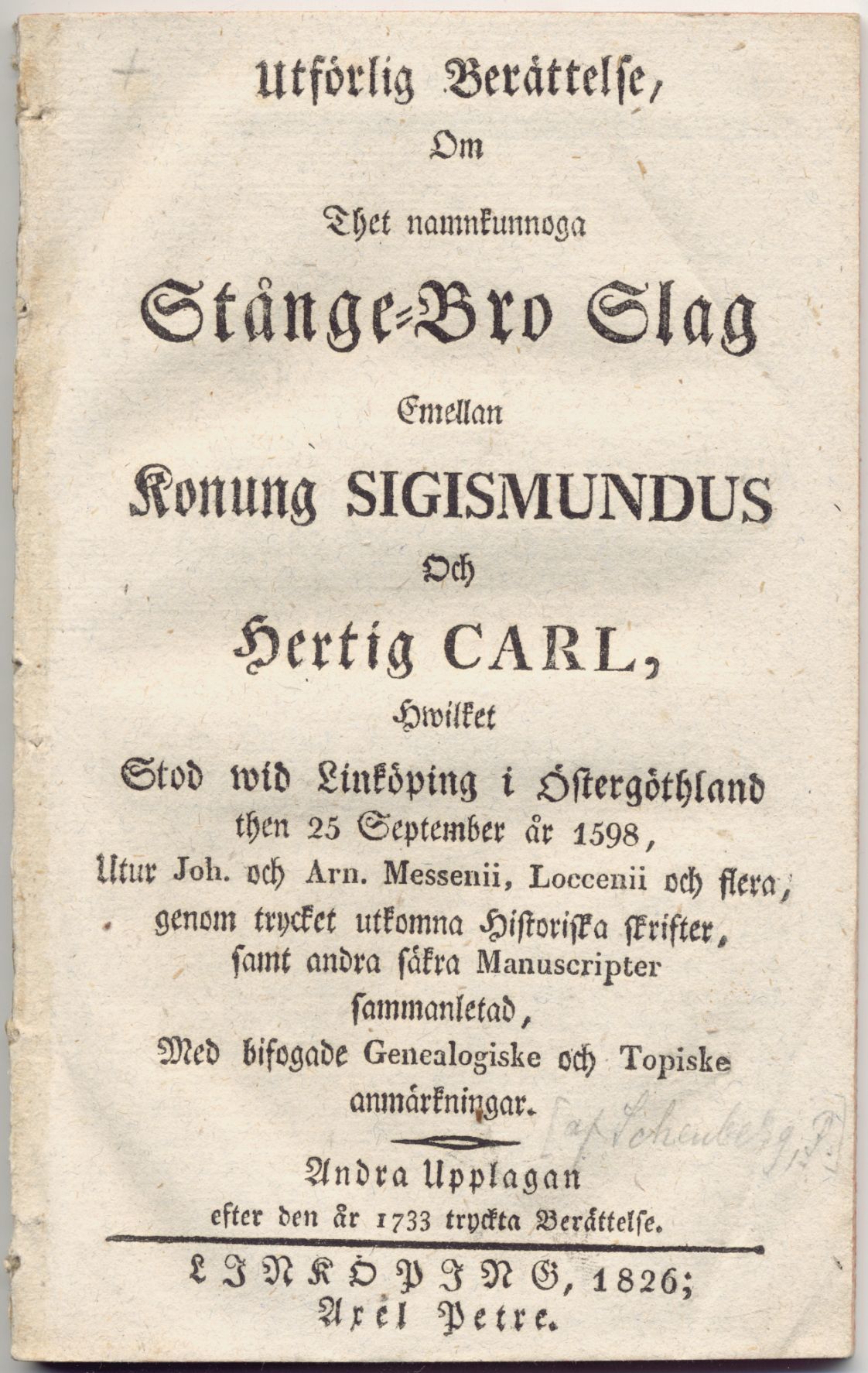 Utförlig berättelse, om thet namnkunnoga Stånge-bro slag emellan konung Sigismundus och hertig Carl, hwilket stod wid Linköping i Östergöthland then 25 september år 1598, utur Joh. och Arn. Messenii, Loccenii och flera, genom trycket utkomna historiska skrifter, samt andra säkra manuscripter sammanletad, med bifogade genealogiske och topiske anmärkningar. Andra upplagan efter den år 1733 tryckta berättelse.