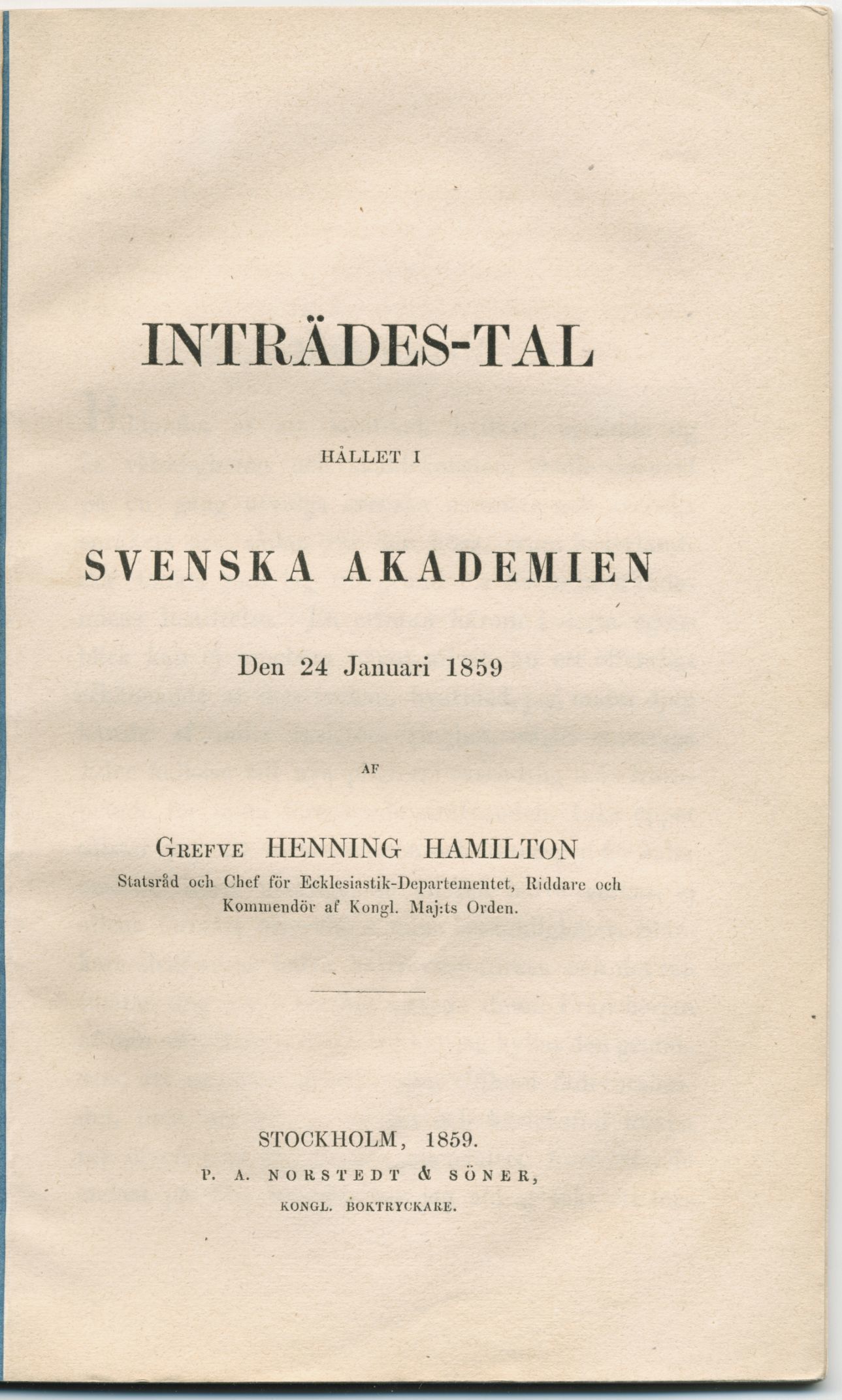 Inträdes-tal hållet i Svenska akademien den 24 januari 1859.