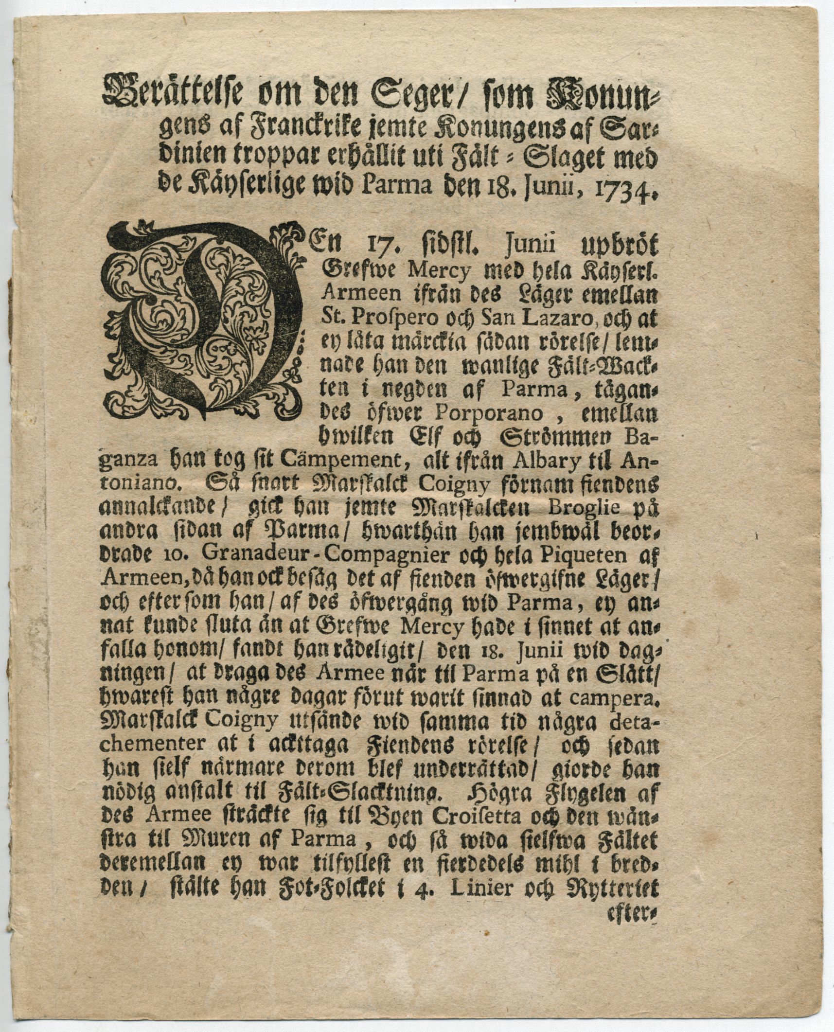 Berättelse om den seger/ som konungens af Franckrike jemte konungens af Sardinien troppar erhållit uti fält-slaget med de käyserlige wid Parma den 18 junii, 1734. [=rubrik].