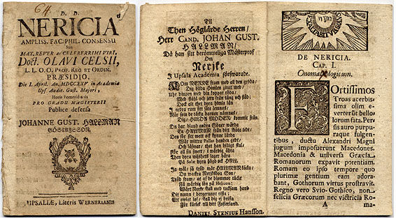 Uppsala, literis Wernerianis, (1725). 12:o. (8),28 s. Med titelvinjett föreställande Närkes vapen. Tagen ur band. Med någon enstaka småfläck. Titelbladet lätt solkigt och med minimal reva överst. Ur L. F. Rääfs bibliotek.