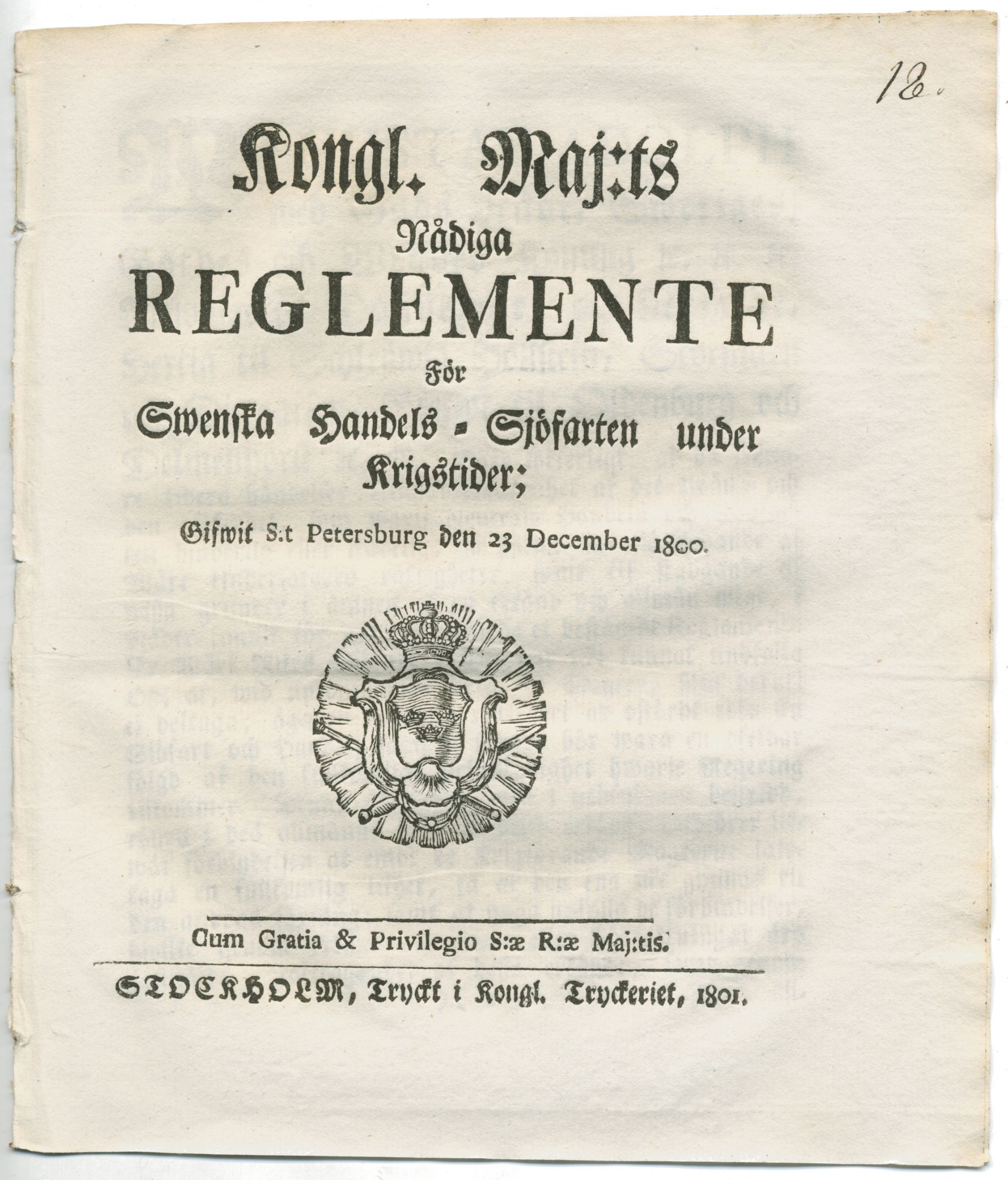 Kongl. maj:ts nådiga reglemente för swenska handels-sjöfarten under krigstider; gifwit S:t Petersburg den 23 december 1800.