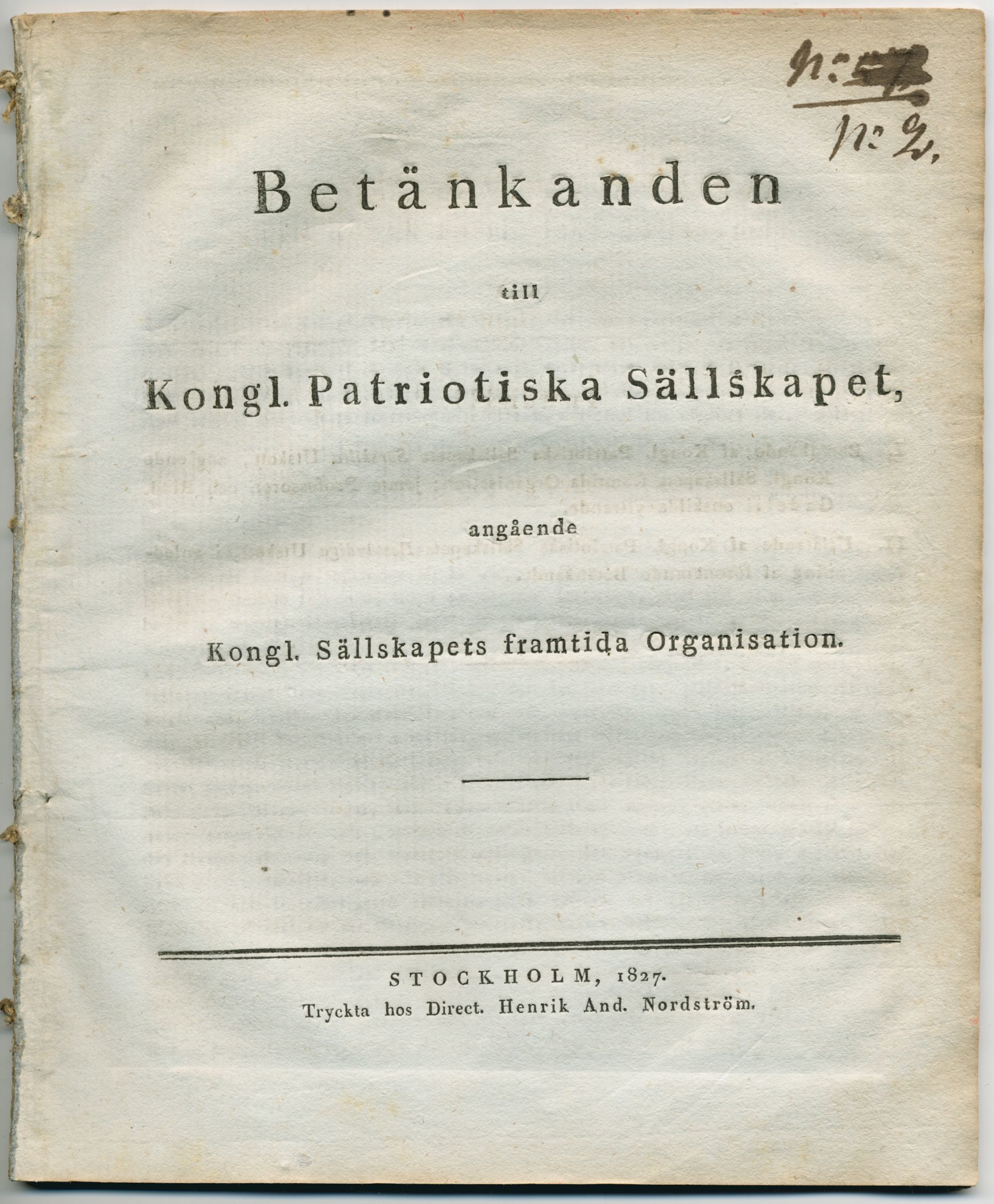 Betänkanden till kongl. Patriotiska sällskapet, angående kongl. sällskapets framtida organisation.