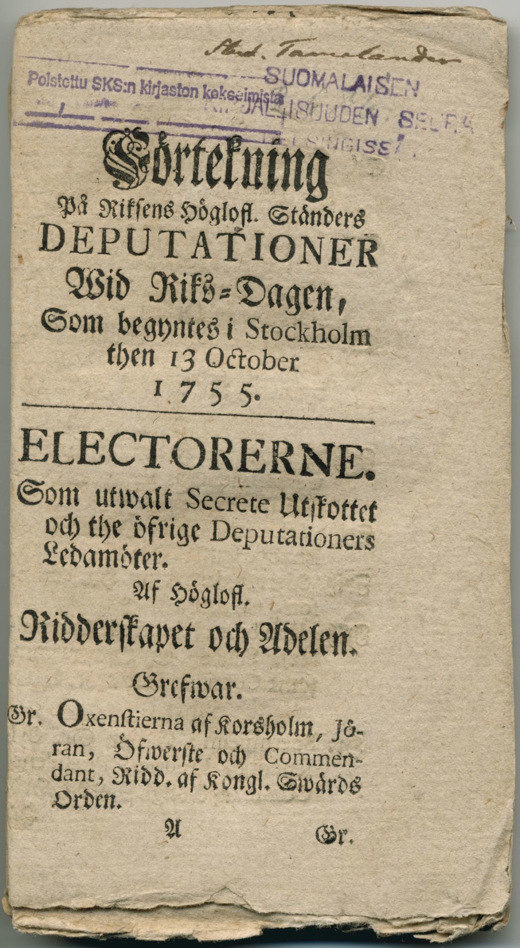 Förtekning på riksens höglofl. ständers deputationer wid riks-dagen, som begyntes i Stockholm then 13 october 1755. [=rubrik].