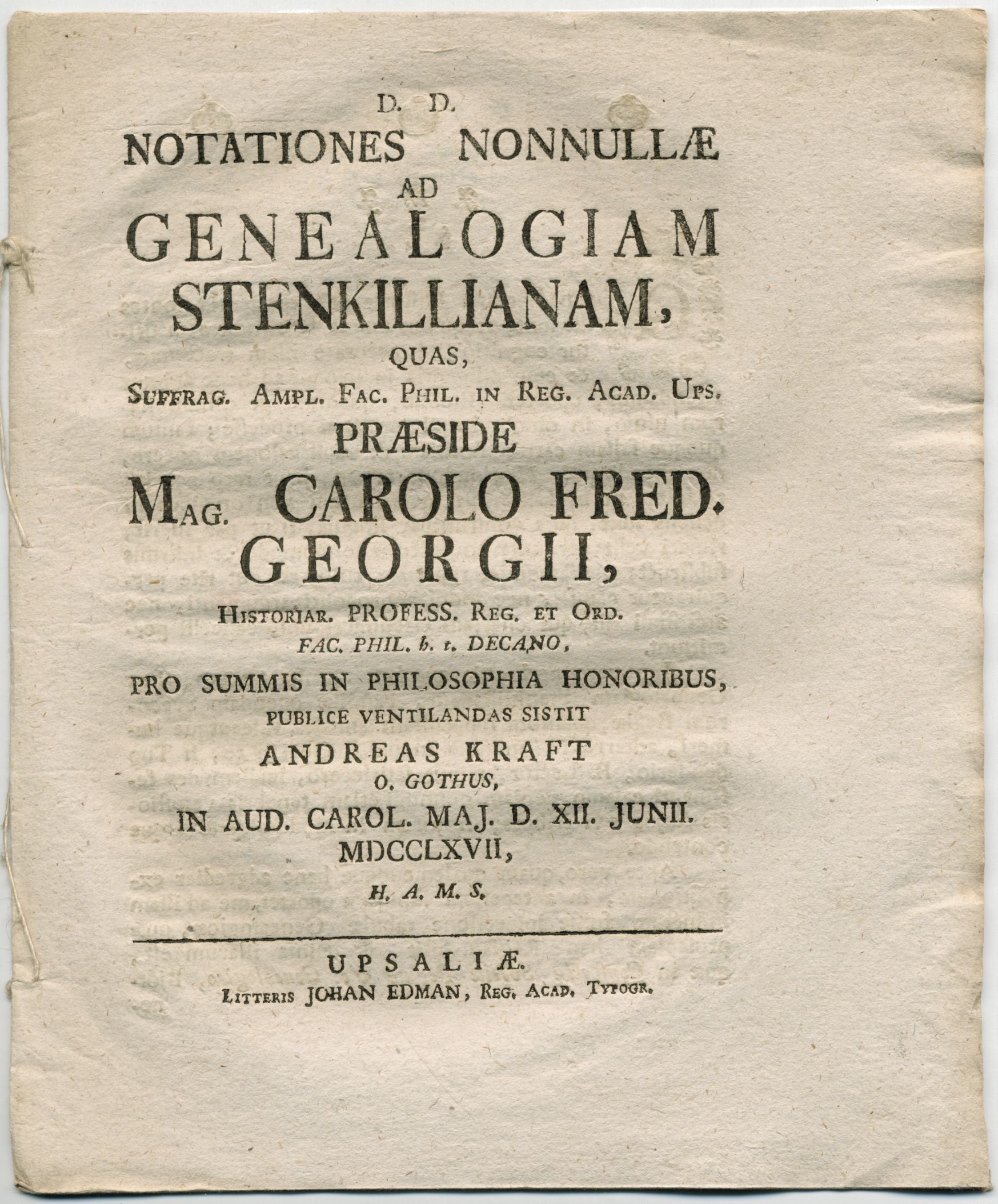 Uppsala, J. Edman, (1767). 4:o. 10 s. & 1 utvikbar tryckt genealogisk tabell. Häftad. Stort fint ex.