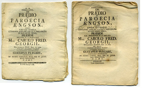 Uppsala, (E. Ziervogel) respektive typis Edmannianis, (1766-67). 4:o. (4),15 + (2),17-26 s. Två häften, del I oskuren. Del II med några bruntonade fläckar mot slutet.