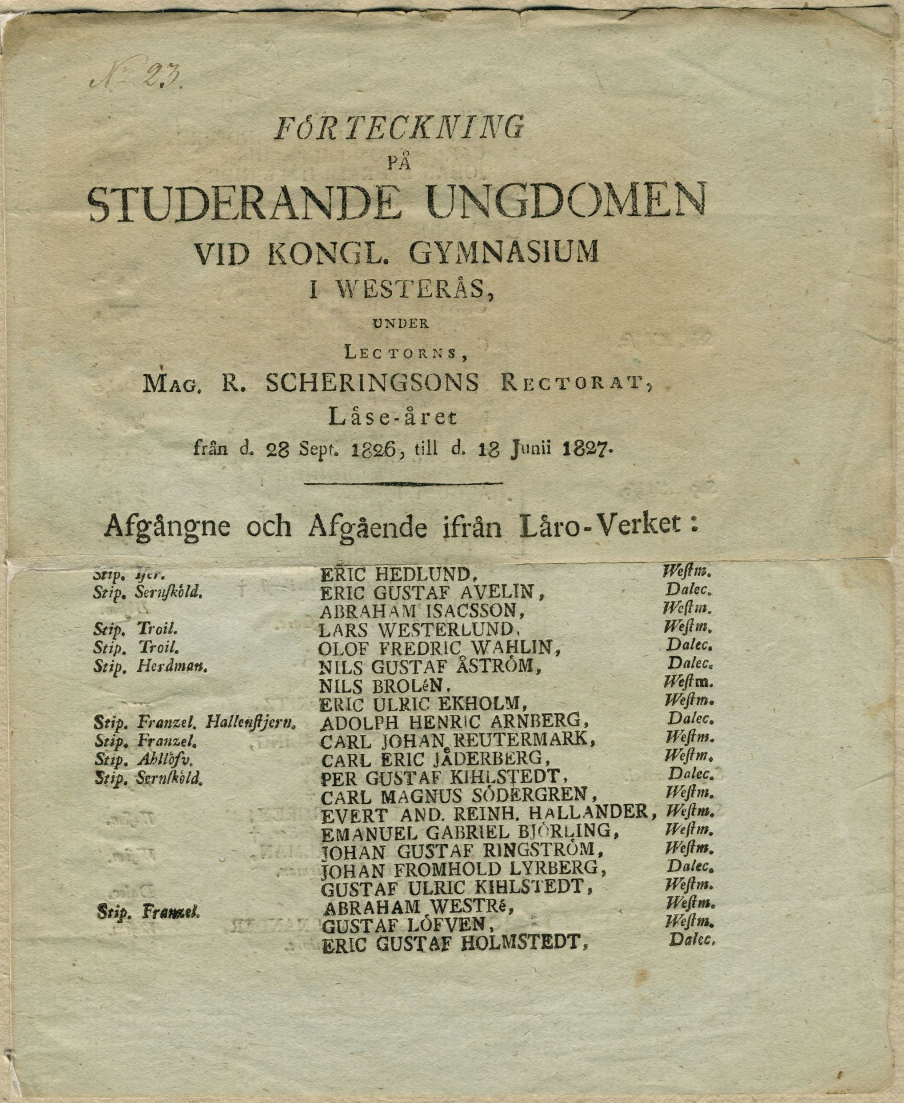 Förteckning på studerande ungdomen vid kongl. gymnasium i Westerås, under lectorns, mag. R. Scheringsons rectorat, läse-året från d. 28 sept. 1826, till d. 18 junii 1827. [=rubrik].
