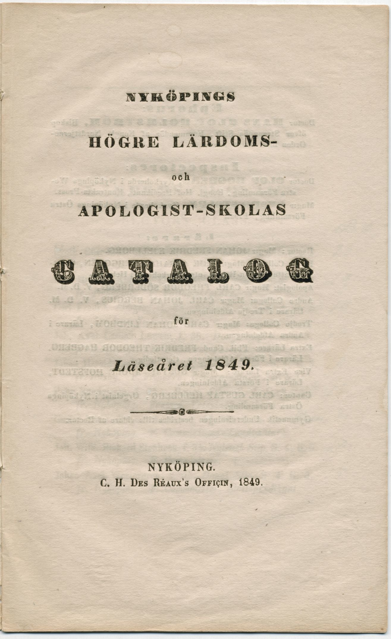 Nyköpings högre lärdoms- och apologist-skolas catalog för läseåret 1849.