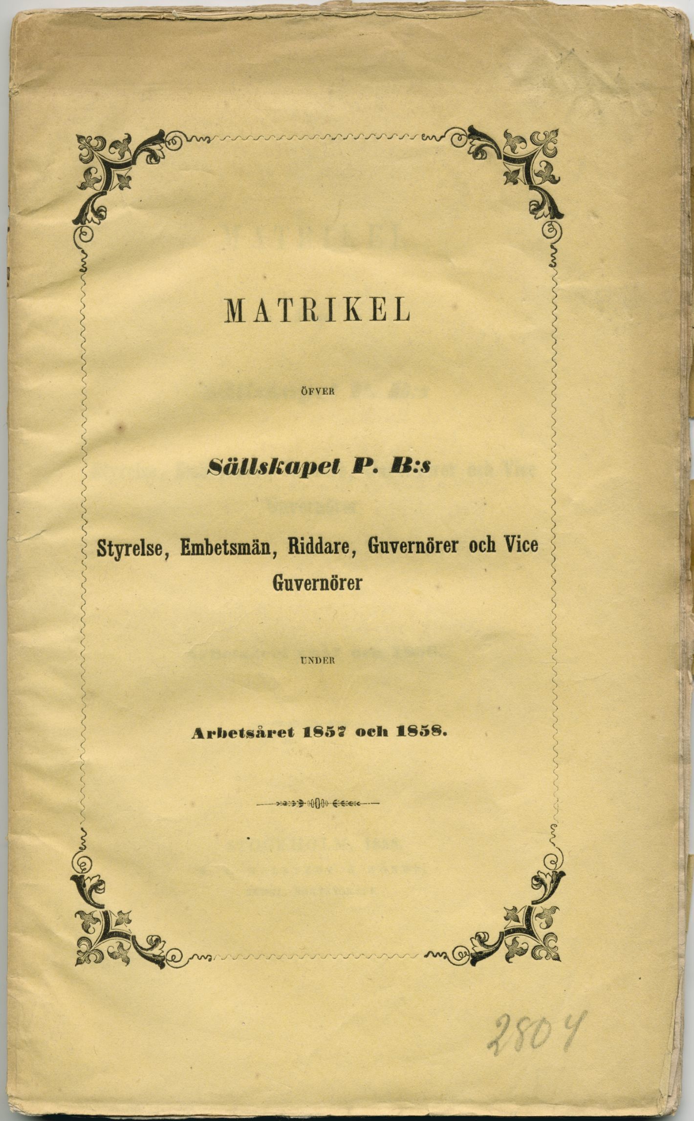 Matrikel öfver sällskapet P. B:s styrelse, embetsmän, riddare, guvernörer och vice guvernörer under arbetsåret 1857 och 1858.