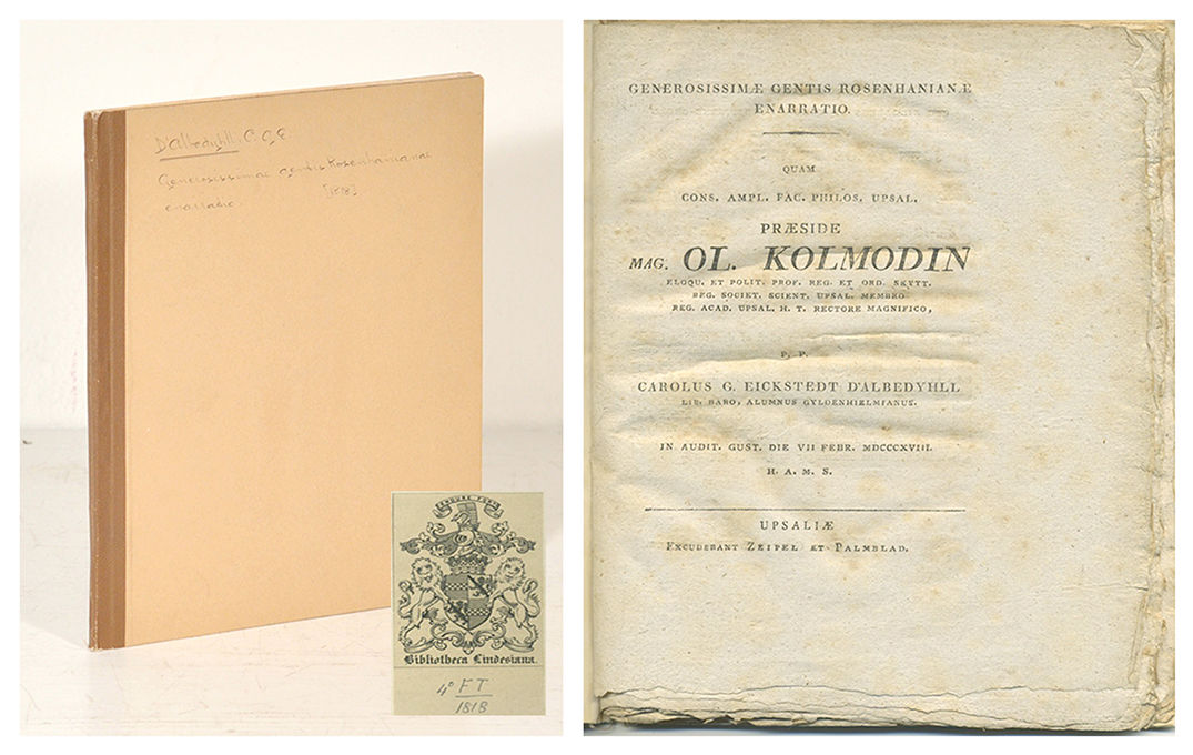 Marklin Catalogus disputationum 32. Almquist Svensk genealogisk litteratur 345. Setterwall Svensk historisk bibliografi 4873. Med en ståtlig tryckt dedikation till Sophia Eleonora Rosenhane, gift Jennings ”den sidsta ättlingen af en vördad och lysande stam”. Carl Gustaf d’Albedyhll (1800-56) var överceremonimästare och stor boksamlare i sin fars efterföljd. Deras bibliotek förvärvades av Carl Jedvard Bonde 1843. Carl Gustaf d’Albedyhll ”som av den Rosenhaneska ättens sista medlem, faderns ungdomsväninna Sofia Eleonora Jennings, f. Rosenhane, från sin spädaste bana mottagit »oupphörligen ökade välgärningar», erhöll av henne förtroendet att bestämma över det stora Rosenhaneska släktarkivet, vilket han 1837 överlämnade till Uppsala universitetsbibliotek” skriver ”Svensk biografiskt lexikon”. Bibliotheca Lindesiana byggdes upp av familjen Lindsay, i synnerhet av den tjugofemte och tjugosjätte earlen av Crawford, Alexander William Crawford Lindsay och James Ludovic Lindsay. Biblioteket kom att innehålla över 200000 titlar och delar av samlingarna försåldes på en rad auktioner under 1800-talets slut. Dessa försäljningar var några av de viktigaste bokauktionerna i England under 1800-talet. Avyttringar har skett även under 1900-talet och återstoden av samlingen förvaltas idag av Skottlands nationalbibliotek.
