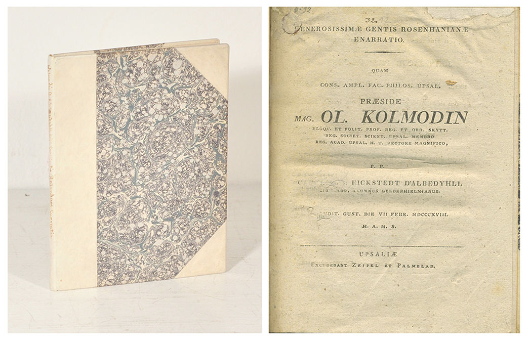 Marklin Catalogus disputationum 32. Almquist Svensk genealogisk litteratur 345. Setterwall Svensk historisk bibliografi 4873. Med en ståtlig tryckt dedikation till Sophia Eleonora Rosenhane, gift Jennings ”den sidsta ättlingen af en vördad och lysande stam”. Carl Gustaf d’Albedyhll (1800-56) var överceremonimästare och stor boksamlare i sin fars efterföljd. Deras bibliotek förvärvades av Carl Jedvard Bonde 1843. Carl Gustaf d’Albedyhll ”som av den Rosenhaneska ättens sista medlem, faderns ungdomsväninna Sofia Eleonora Jennings, f. Rosenhane, från sin spädaste bana mottagit »oupphörligen ökade välgärningar», erhöll av henne förtroendet att bestämma över det stora Rosenhaneska släktarkivet, vilket han 1837 överlämnade till Uppsala universitetsbibliotek” skriver ”Svensk biografiskt lexikon”. Boken härrör från Eugène Lewenhaupts del av bibiblioteket på Säbylund. Han var som bibliotekarie på Uppsala universitetsbibliotek ansvarig för uppordnandet av det Rosenhaneska arkivet och skrev artikeln ”Rosenhaneska handskriftssamlingen i Uppsala universitetsbibliotek” i en festskrift 1921.