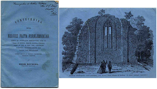 Teijler Litteratur om Örebro län 4569. Harbe Litteratur om Västernärke s. 4. Fiske Runic literature s. 32. På omslagets baksida återfinns en trevlig avbildning av Riseberga klosterkyrkas ruin. Den antikvariska skriftställaren Herman Hofberg (1823-83) var vid denna tid Närkes fornminnesförenings sekreterare. Han var åren 1852-68 distriktsläkare i Edsberg och blev senare ledamot av Vitterhetsakademien. Hofberg står som utgivare till bl.a. ”Svenskt biografiskt handlexikon”.