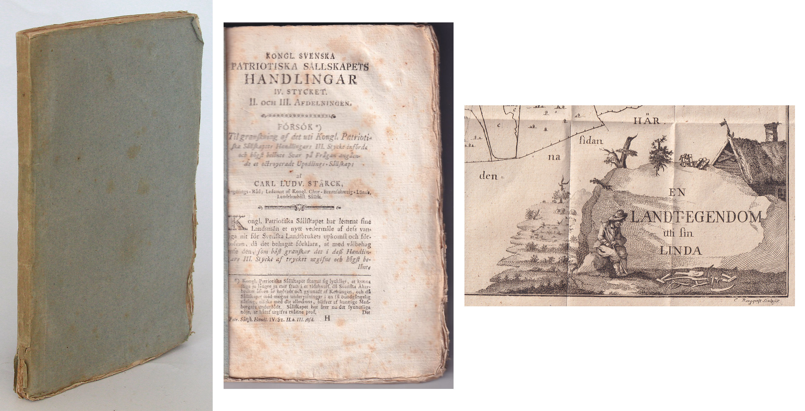 Patriotiska sällskapets handlingar utkom i sammanlagt sex delar. Föreliggande häfte består i sin helhet av artikeln ”Om et upodlings-sällskap i Sverige m.m.” av C. L. Stårck. De fina kartorna, varav den första är signerad C. Bergqvist, visar ”En landt-egendom i sin linda”, ”En landt-egendom under sin upodling” och ”Charta öfwer en del af ägorna till en bonde-gård uti Hallands län”. Den sistnämnda ligger vid Nissan och gränsar till Boås och Moshults ägor.