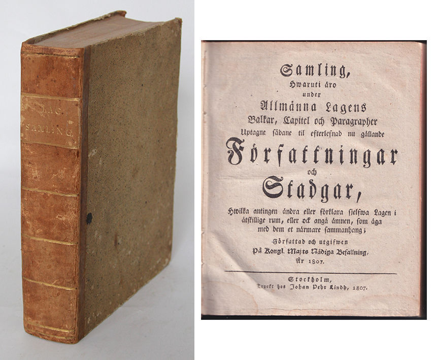 Sthlm, J. P. Lindh, 1807. 4:o. (2),712,(2) s. + Register öfwer den på kongl maj:ts nådiga befallning utgifne samlingar af författningar och stadgar, som ändra eller förklara lagen i åtskillige rum. Sthlm, J. P. Lindh, 1808. 4:o. (2),142 s. Samtida ngt nött hfrbd med sparsamt guldornerad rygg och ljusbrun titeletikett i glättad papp. Rödstänkta snitt. Pärmkanterna nötta, ryggen med skrapmärken. Några enstaka lätt lagerfläckade blad och smärre fuktränder i nedermarginalen. Med ovalt exlibris ”Tillhörig L. J. Sederholms bibliotek”. Från Näfveqvarn. Med stpl, numrering och gallringsstpl från Sigtunastiftelsen.