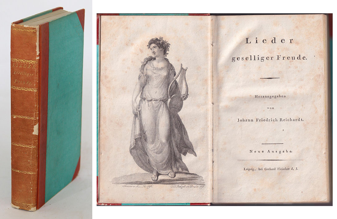 Leipzig, bei Gerhard Fleischer der Jüngere, u.å. 8:o. XVI,119 + XVI,144 s. & 3 grav plr. + REICHARDT, JOHANN FRIEDRICH. Neue Lieder geselliger Freude. I-II. U.o., u.å. 8:o. Grav. front,(2),76 + (2),60 s. Samtida lätt nött pappbd med tegelröd mönsterpressad och guldornerad rygg samt ljusblå glättade pärmpapper. Gula snitt. Ryggen med flagnat ytpapper på några ställen. Planscherna och de inledande bladen lagerfläckade. Från Näfveqvarn. Med stpl, numrering och gallringsstpl från Sigtunastiftelsen.