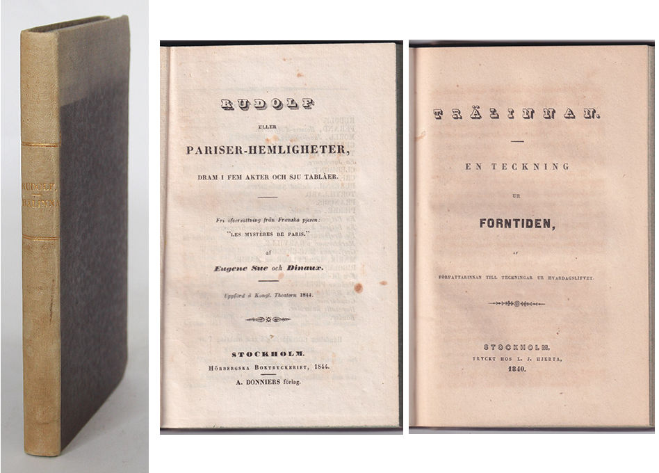 Sthlm, Hörbergska boktryckeriet, 1844. Stor 12:o. 95 s. + (BREMER, FREDRIKA) Trälinnan. En teckning ur forntiden, af författarinnan till Teckningar ur hvardagslifvet. Sthlm, L. J. Hjerta, 1840. Stor 12:o. 115,(1 blank,4) s. Samtida violett mönsterpressat klbd med titel i guld på ryggen och grönstänkta snitt. Blekt rygg och övre frampärm. Titelbladet till det första arbetet med några småfläckar, annars bara enstaka småfläckar. Med Johan Sederholms namnteckning. Från Näfveqvarn. Med stpl, numrering och gallringsstpl från Sigtunastiftelsen.