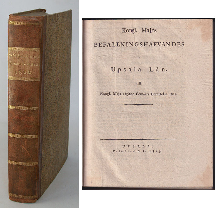 Uppsala, Palmblad & c. respektive Sthlm, O. Grahn, E. A. Ortman, H. A. Nordström, F. B. Nestius, Kongl. tryckeriet, S. Rumstedt respektive Marquardska boktryckeriet, 1823. 4:o. Separat kollationering finns. Samtida bra, lätt nött hfrbd med guldornerad rygg och ljusbrun titeletikett i glättad papp. Blåstänkta snitt. Från Näfveqvarn. Med stpl, numrering och gallringsstpl från Sigtunastiftelsen. På frampärmens insida bläcknumrering 146 och anteckningen ”Härtill hörer ett band med tabeller in folio”, vilket tyvärr saknas här.