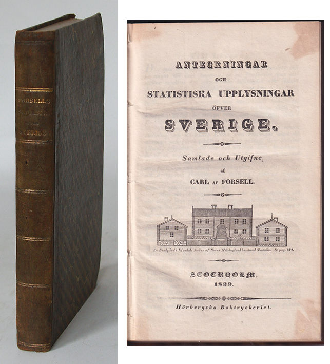Setterwall Svensk historisk bibliografi 5571. Titelvinjetten föreställer bondgården Simanbo i Ljusdal. Illustrationen på s. 335 är en tjärdal i genomskärning. Med rubriker som ”Förtjenar Sverige att beresas, att ses, att kännas?” och ”Om sättet att resa i Sverige”. Carl af Forsell (1783-1848) var kartograf, statistiker, militär, publicist och kanske mest känd för sin ”Statistik öfver Sverige” som utkom första gången 1831.