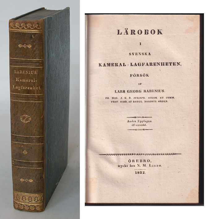 Första upplagan trycktes 1825, denna andra upplaga har ett nytt förord utöver det ursprungliga. I det omtalas att en hel del fel här är rättade och ändringar har införts utifrån de kameralförfattningar som utkommit sedan första upplagan. Lars Georg Rabenius (1771-1846) var rättslärd och professor i Uppsala. Denna lärobok var långt in på 1900-talet ett ofta använt referensverk inom juridiken.