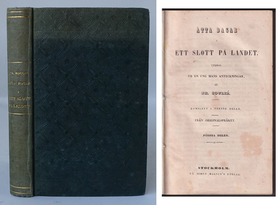 Utgiven på Simon Magnus förlag. Det franska originalet utkom 1843 under titeln ”Huit jours au chateau – extrait des mémoires d’un jeune homme”. Frédéric Soulié (1800-47) var fransk dramatiker och romanförfattare. Johan Sederholm (1813-83) övertog efter studier i Uppsala skötseln av Näfveqvarns bruk där han var brukspatron till sin död. Försättsbladet i denna volym med pappersbruket Periodens vattenmärke, vilket kan tyda på att boken är bunden i Nyköping.